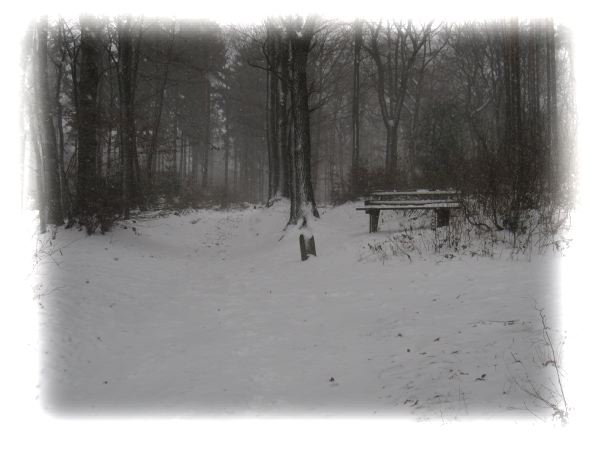 Verschneite Bank im Wald.