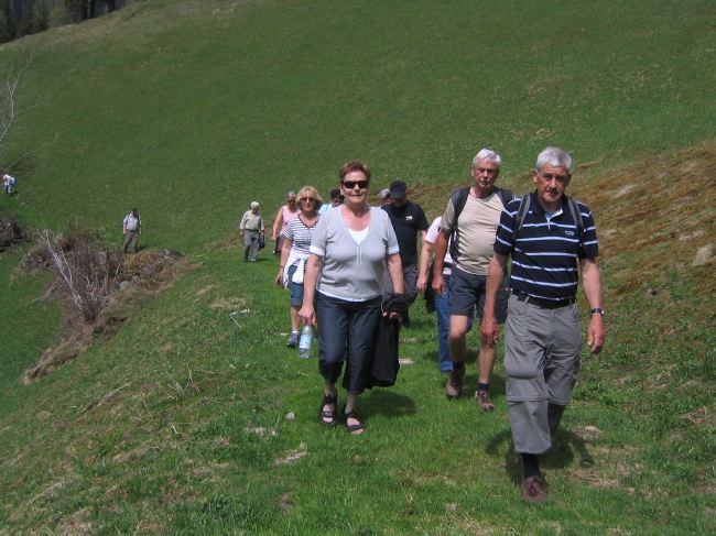 Der Weg führt über langsam ergrünende Wiesen.