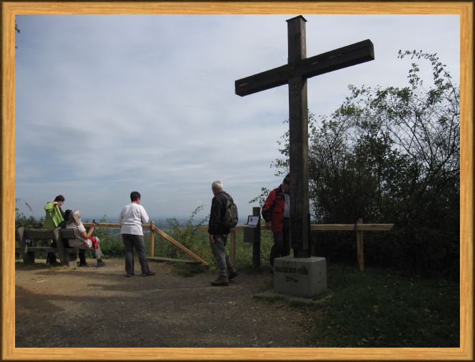 Hierauf der Glessener Höhe gibt es sogar ein Gipfelkreuz in 204 m Höhe mit der Möglichkeit, sich in einem Gipfelbuch einzutragen. Herbert hat das für uns gemacht.