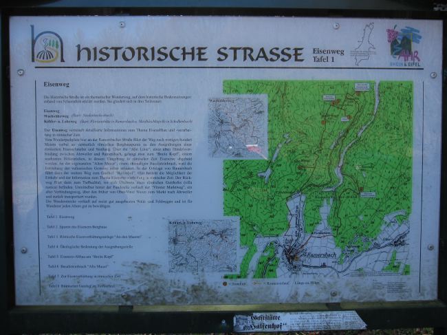 Wie die Infotafel am Parkplatz zeigt, geht es von hier aus auf die historische Straße "Eisenweg"