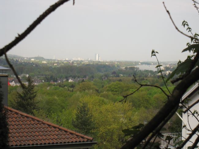 Oberhalb der letzten Häuser eröffnet sich erstmals ein Blick auf Bonn mit einem anderen Stück moderner Architektur: dem Post-Tower.