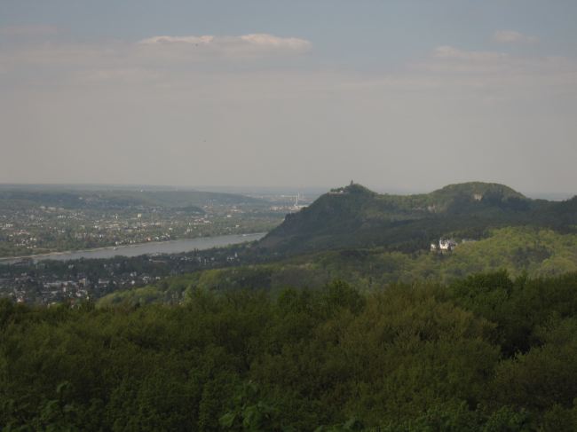 Kurz unterhalb des Gipfels ein Blick auf den Drachenfels mit Bonn dahinter.