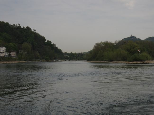 Nach Norden schweift der Blick über die Insel Nonnenwerth, auf den im vergangenen Winter von seiner Efeuhülle befreiten Rolandsbogen und den von seinem 70er-Jahre-Pavillion befreiten Drachenfels.