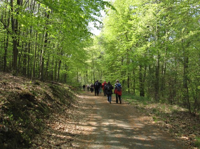 Der Weg führt jetzt wieder durch hellen Frühlingswald