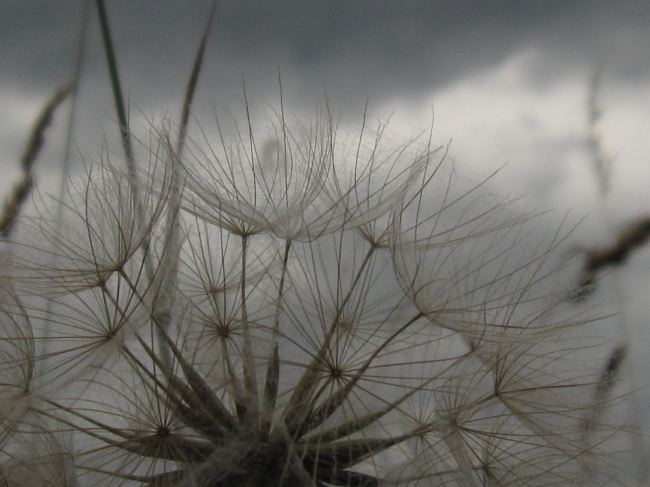 Fruchtstand des Wiesenbocksbarts vor Eifelwolken.