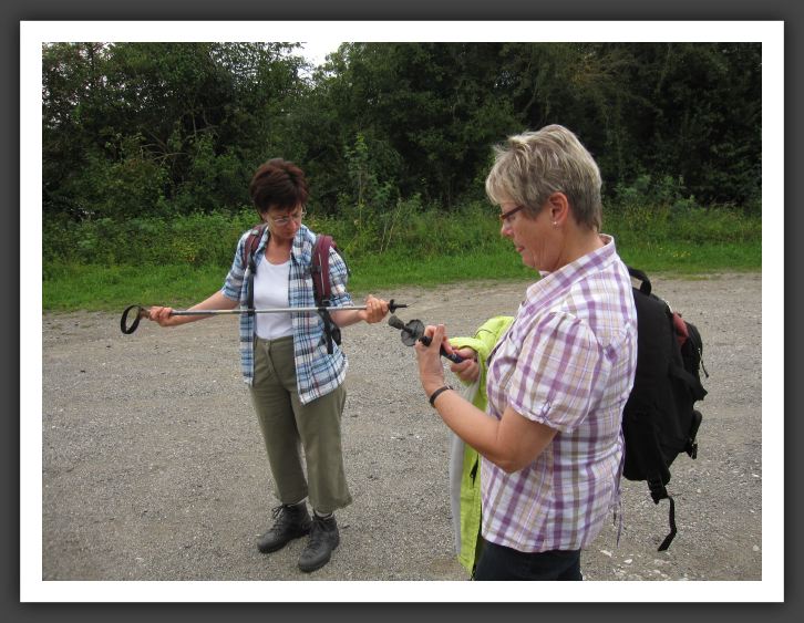 Nach dem Treffen in Merzbach und einer wunderschönen Anfahrt durch einsame Eifeltäler erreichen wir den Parkplatz bei Kerpen. Hier müssen erst einmal die Stöcke auf Länge gebracht werden.