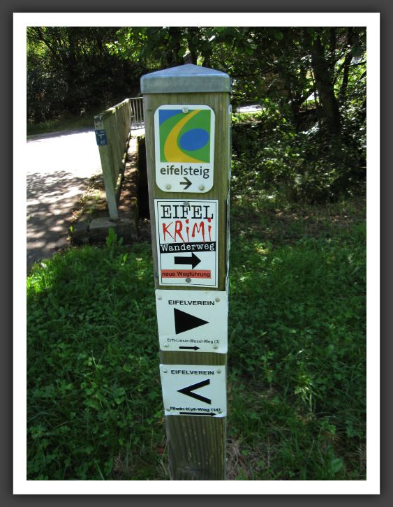 Ein schönes Stück Eifel, wie an der Vielzahl der ausgeschilderten Wanderwege zu ersehen ist: Eifelsteig, Eifel-Krimi-Wanderweg Erft-Lieser-Mosel-Weg und Rhein-Kyll-Weg teilen sich diesen Streckenabschnitt...
