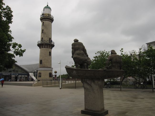 Der Leuchturm und davor die Skulptur mit dem Titel "Lotsenehrung"