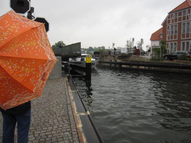 Am Dienstag Morgen machen wir uns auf den Weg nach Warne. Dafür müssen wir in Malchow über die Insel. Heute hält uns aber zunächst einmal die Drehbrücke auf.