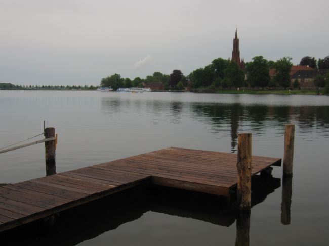 Über einen kleinen Bootssteg schaut man auf das ehemalige Kloster Malchow. Dort ist heute das mecklenburgische Orgelmuseum untergebracht.