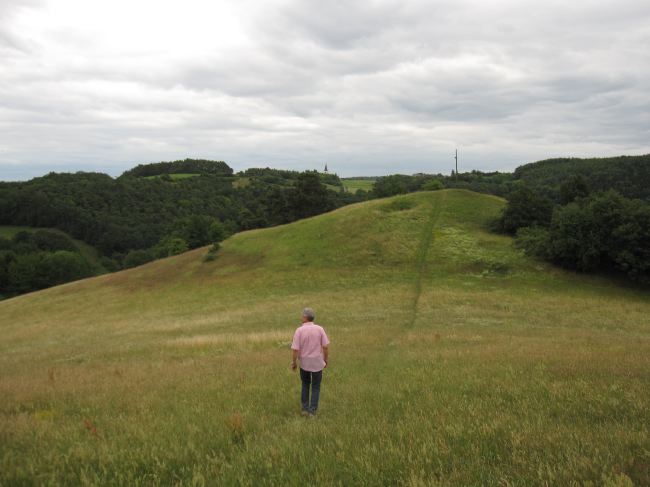 Etwas abseits des Weges wartet die Bergkuppe mit dem Gipfelkreuz auf uns. Der Eulenberg. Herrmann erkundet für uns schon mal den Weg.